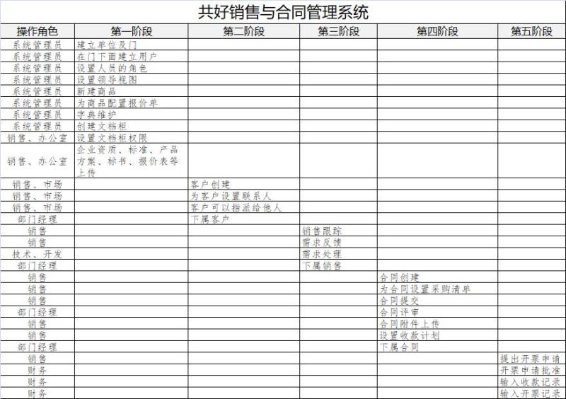 系統提供了,從客戶新建-客戶分配-銷售跟蹤-需求處理-合同新建-合同評審-開票申請-收款經理-開票記錄及收款計劃等操作過程(涉及:市場部、銷售部、財務部等多個部門工作協同)