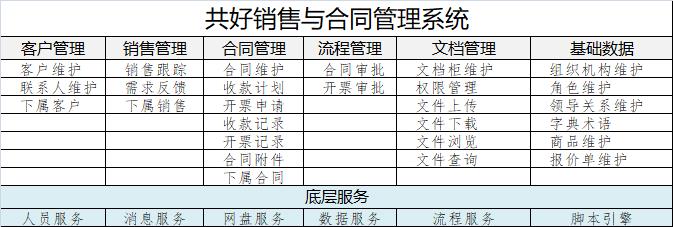 共好合同管理系統包括:客戶維護、銷售跟蹤管理、客戶需求管理、合同管理、流程評審、企業文檔管理、企業即時通訊平臺等模塊組成
